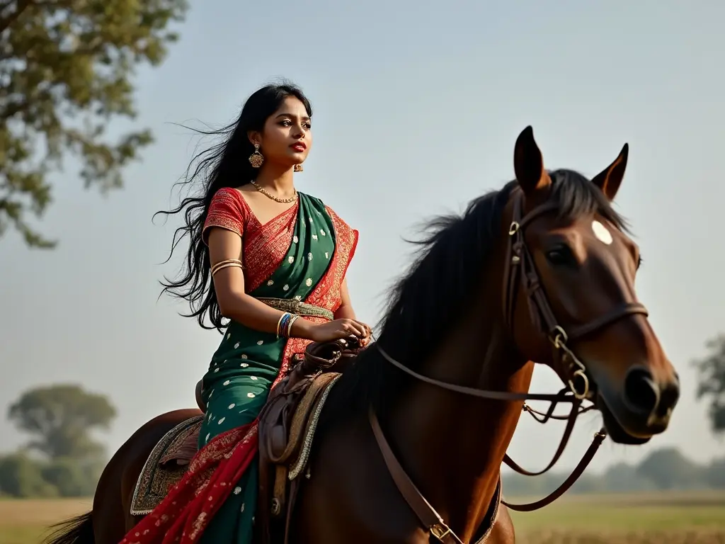 Prompt: Beautiful traditional woman riding a horse in Bangladesh