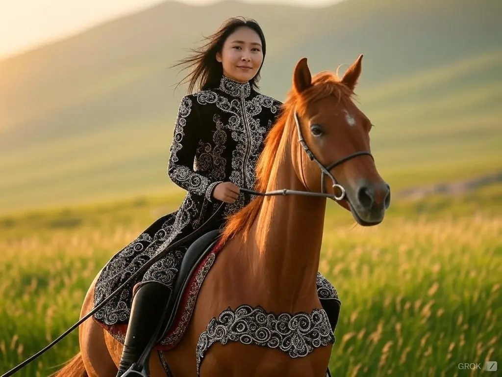 Prompt: Beautiful traditional woman riding a horse in Mongolia