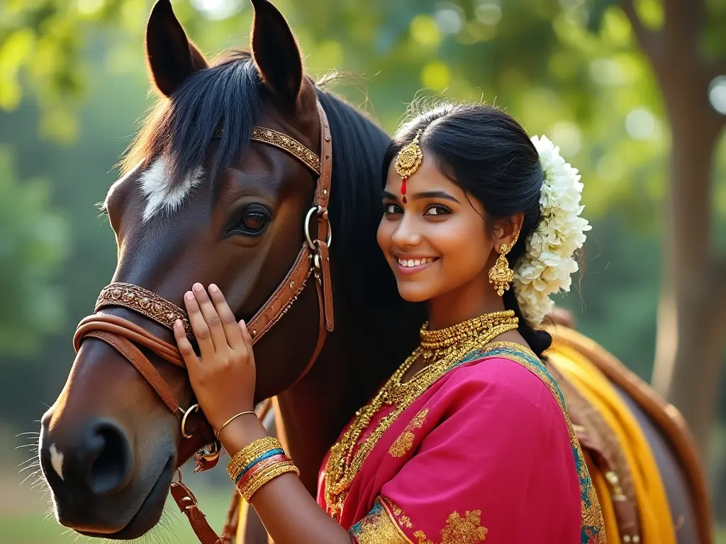 Prompt: Beautiful traditional woman with a horse in Sri Lanka